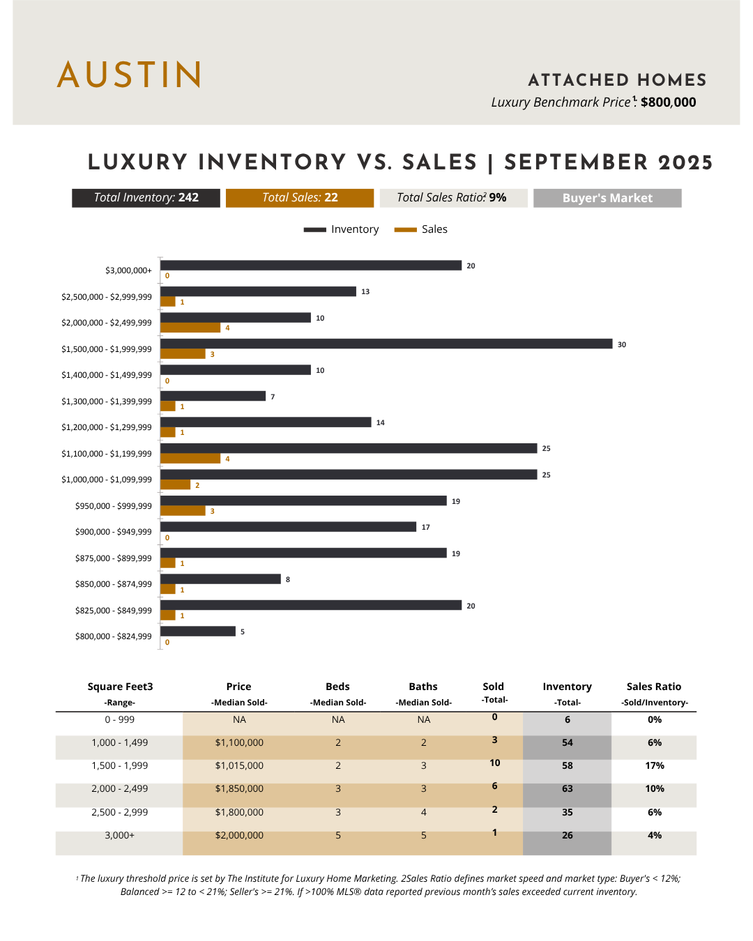 The attached luxury segment — condos, townhomes, and villas — registered a 9% sales ratio, placing it in buyer’s market territory overall.