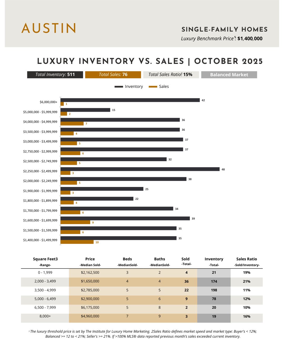 The Austin single family luxury market is currently considered a balanced market with a 15% sales ratio .