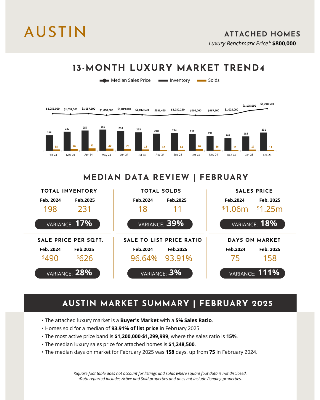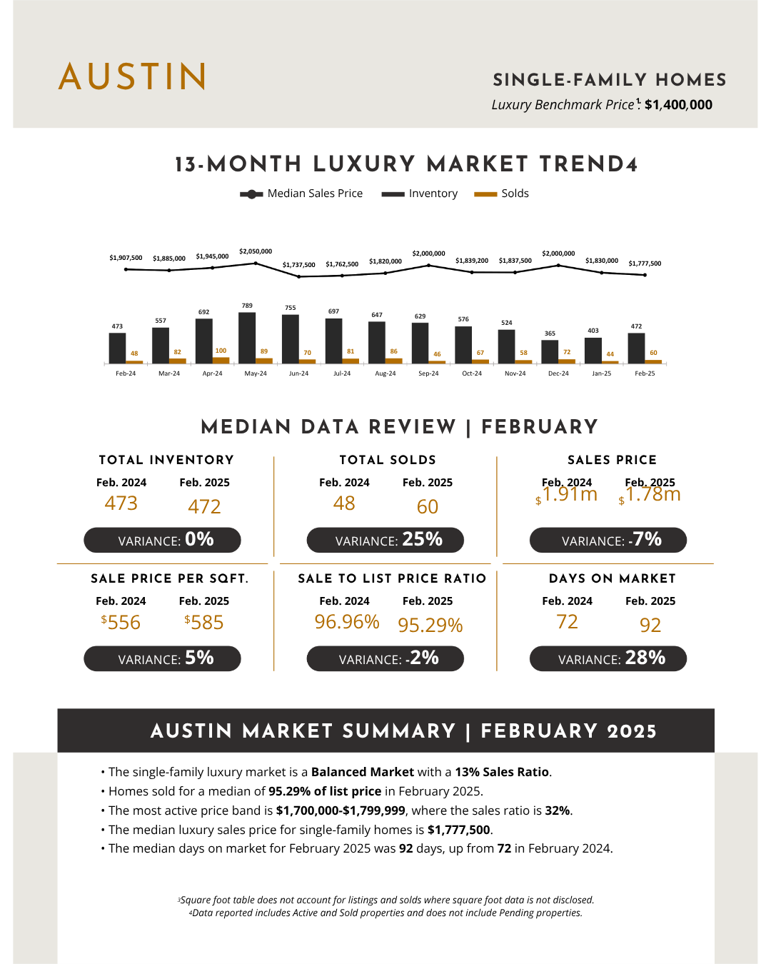 The luxury benchmark price for Austin remains $1.4 million, with the median luxury sales price at $1.83 million and the median days on market down to 57 days — a notable improvement from 65 days last year.