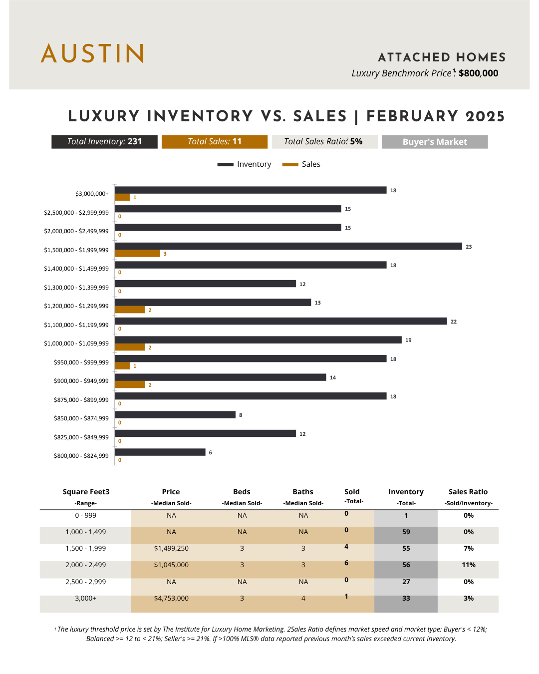 The attached luxury market (condos, villas, and townhomes) also showed steady movement, with a 9% sales ratio — a buyer’s market overall, but again, selective strength in key areas.