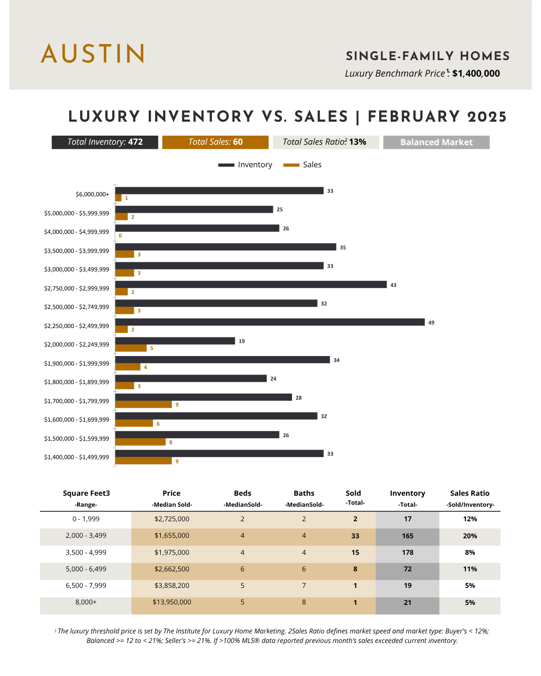 As we head into the spring season, Austin’s luxury market continues to show strength and select opportunity. According to the February data from the Institute for Luxury Home Marketing, the market as a whole still leans toward buyers, but we’re seeing clear seller advantages emerge in certain price segments — especially between $1.5M and $1.6M, where homes are selling faster and closer to list price.